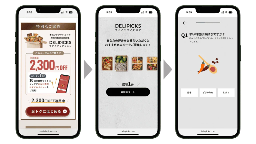 DELIPICKSはシェフが監修の美味しい料理が詰まった、自分のペースでも利用しやすい宅食弁当です。質問に答えると、好みのメニューを提案してくれる点が大きな特徴です。