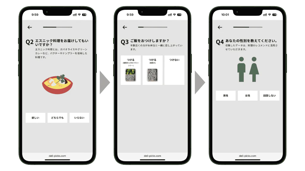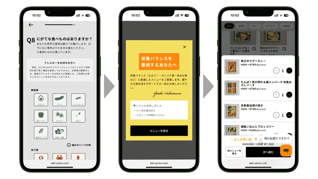 DELIPICSはいくつかの質問に答えるだけで、100種類以上の豊富なメニューから好みに近いメニューを提案してくれます。辛さやエスニック料理の有無、食べたいメニューのイメージ、栄養素、苦手な食材など詳細に確認してくれます。