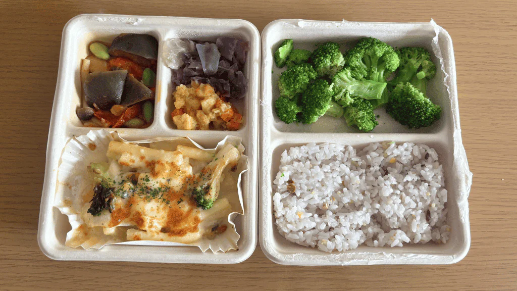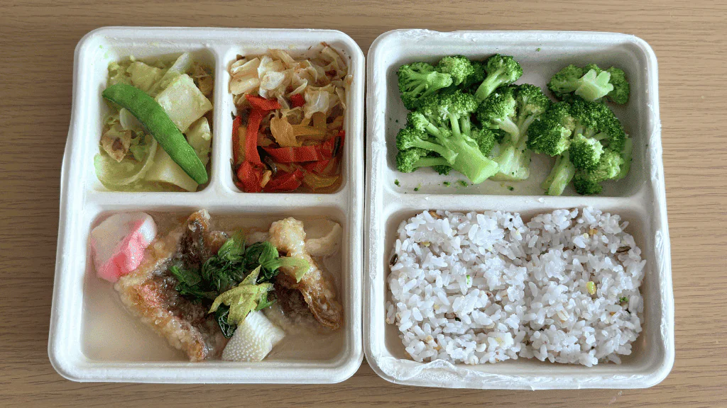 白身魚の揚げ物は、外側はカリッと、中はふんわりとしており、冷凍ながらも料理したてのような味を楽しめました。揚げ物と一緒に入っている野菜や麩も美味しいです。ただ、たけのこは水分が多めで独特の触感でしたが、全体のバランスとしてまとまりがありました。