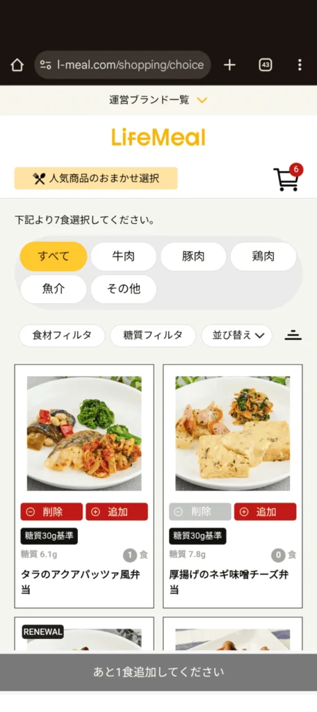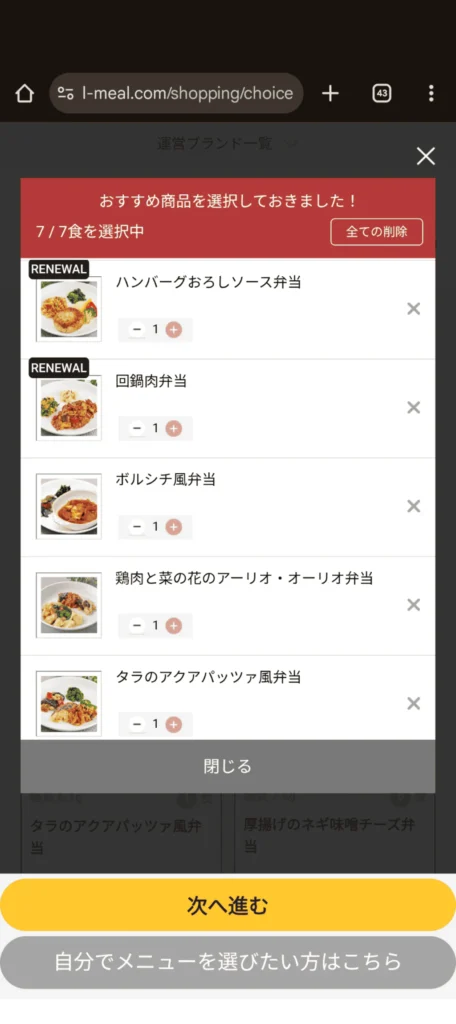 プランを選択すると、おすすめの商品が自動選択されます。自分で選びたい場合は、「閉じる」を押して好きなメニューを選んでください。入っている食材や糖質でフィルターもかけられます。