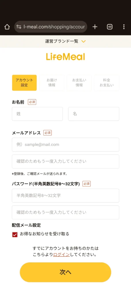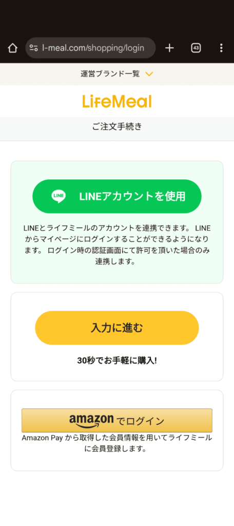 メニューを選択したら、注文に必要な事項を入力します。LINEやamazonアカウントを利用できるほか、自分で必要項目を入力して申し込むことも可能です。以下は、自分で必要事項を入力する場合の画面となります。