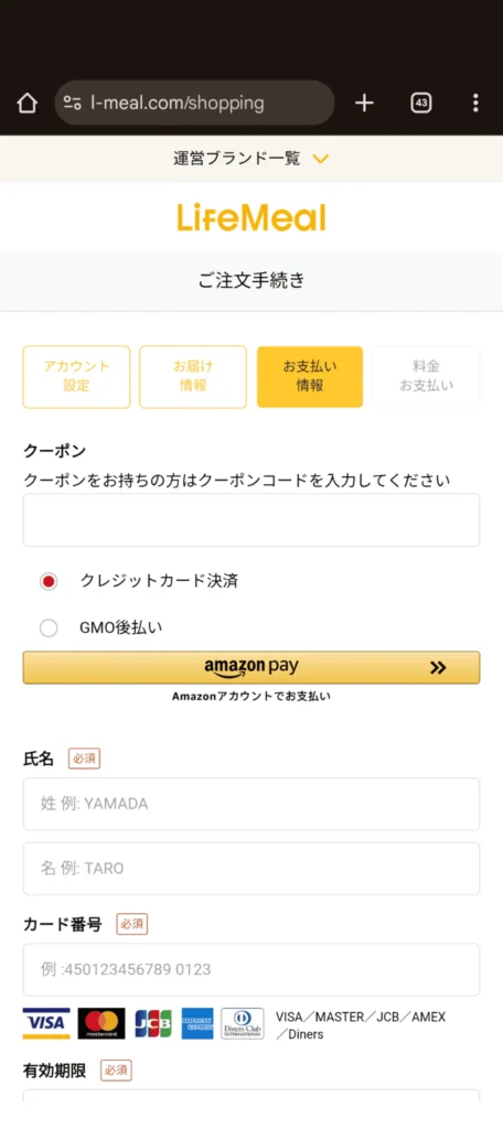 最後にクーポン情報の入力と支払い方法を選択します。支払い方法は、クレジットカード決済かGMO後払い、amazon payから好きなものを選んでください。確認画面で、注文内容に間違いがないかチェックして申し込みボタンを押すと完了です。