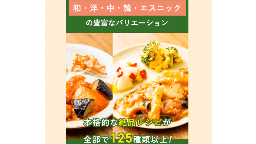 各専門家がチームを組んで試作を重ねた、和・洋・中・韓・エスニックのレシピが豊富です。125種類以上のメニューがあり、定期的に入れ替えが行われているため、飽きにくい工夫がされています。