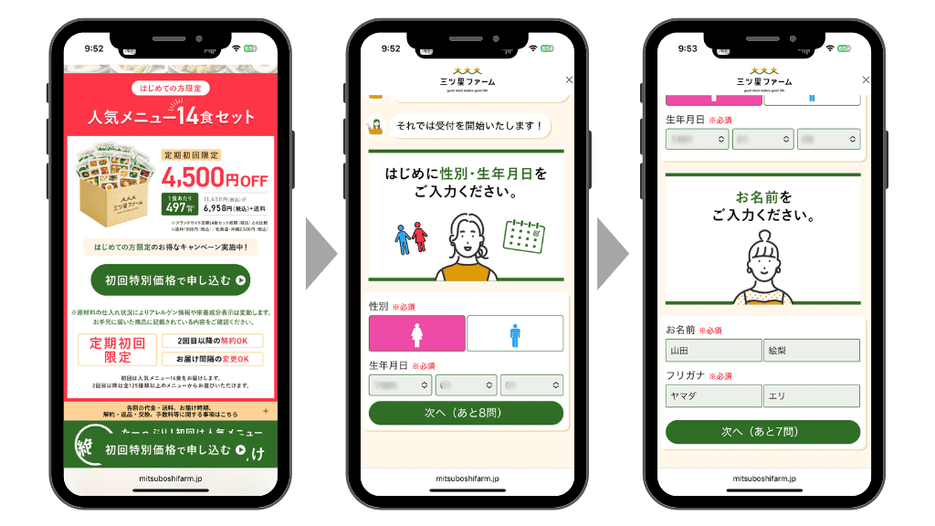 以下の画像を参考に、性別、生年月日、名前、住所などの配達に必要な情報を入力していきます。
