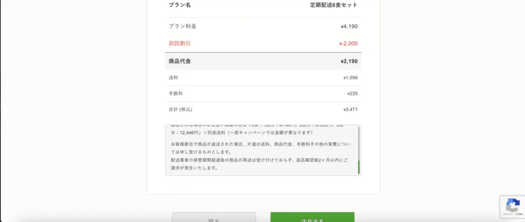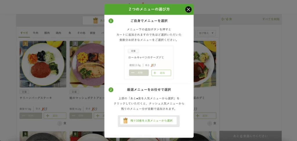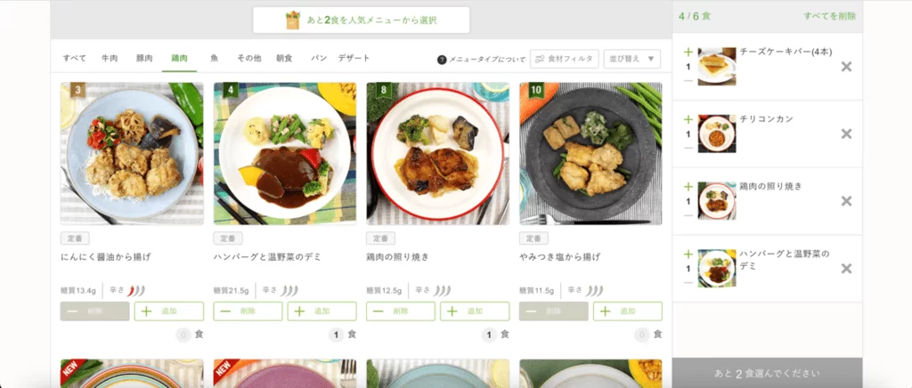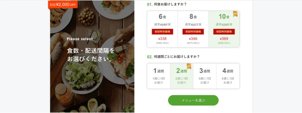 最初に食数と配送間隔を選びます。筆者は初めての注文なので割引になっているようです。「6食、2週間に1回」を選択しました。