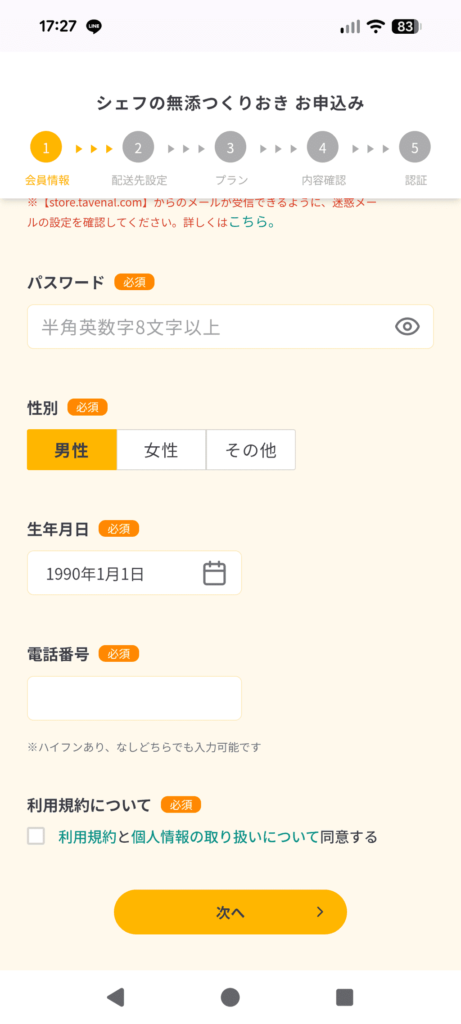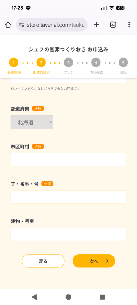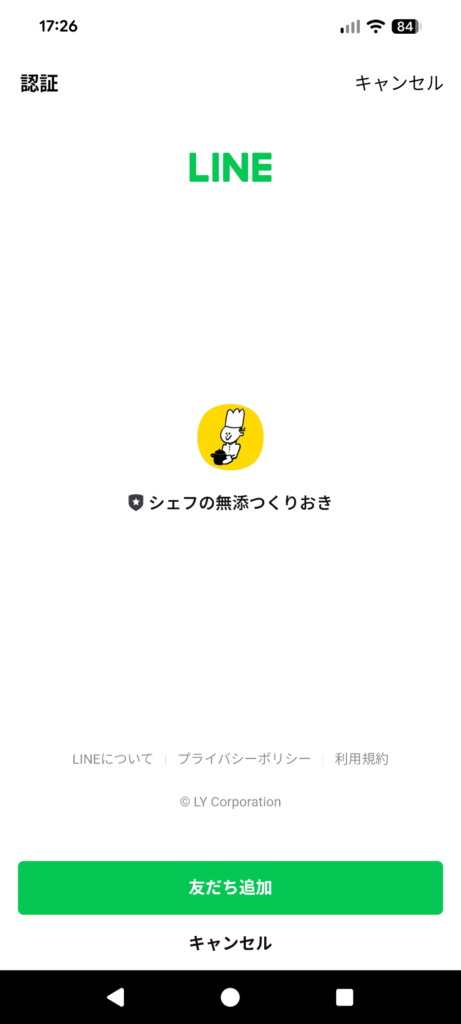 シェフの無添つくりおきの注文方法はとてもシンプルです。まず公式サイトにアクセスし、申し込みボタンを押すと、LINEアカウントかメールアドレスのどちらかで進めます。筆者はLINEを選び、そのまま友だち追加してみました。
