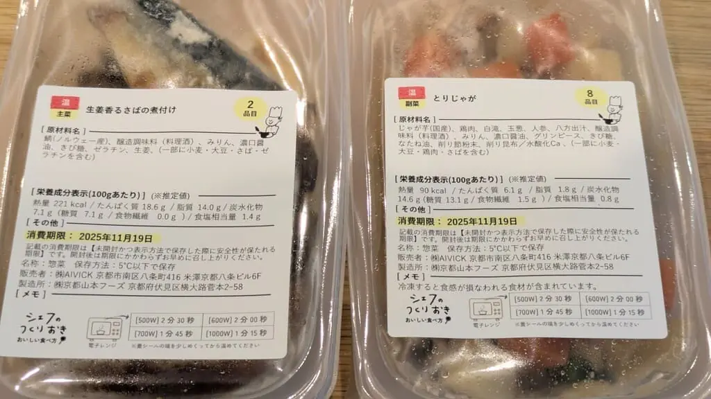 各パックには品目数や消費期限、温め時間などが記載されており、食感が損なわれやすい食材が含まれる場合は、その旨がラベルでわかるようになっています。