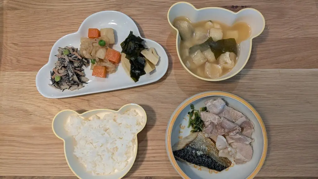 子どもは見慣れない和食に最初は興味を示しませんでしたが、食べ進めるうちに自然と手が伸び「おかわりある?」というほど気に入っていました。以下の写真は、子どものおかずにご飯とみそ汁を添えただけですが、しっかりとした食べ応えがあります。