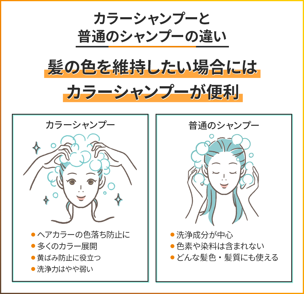 一方、カラーシャンプーは染料を含んでおり、洗髪のたびに色を髪に補う仕組みになっています。