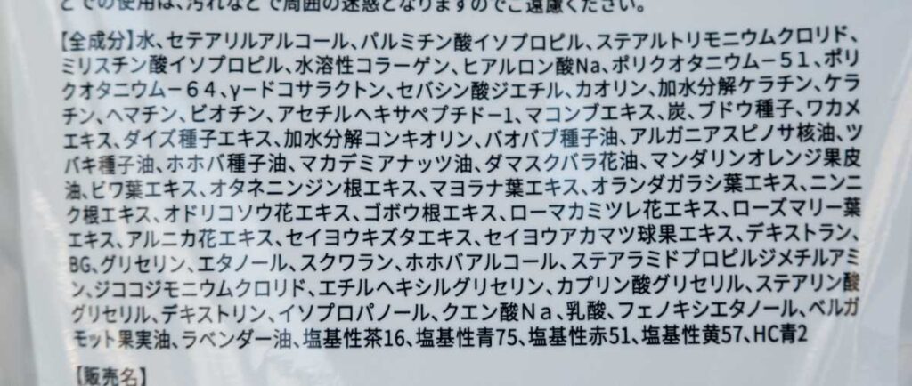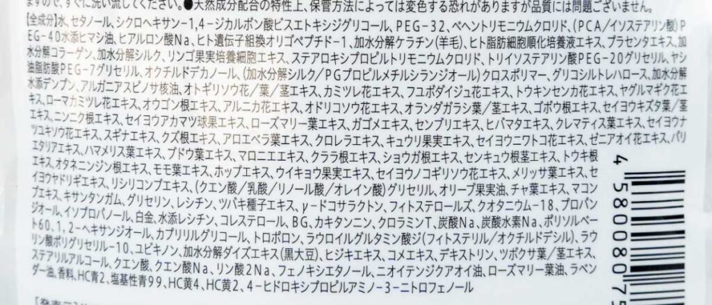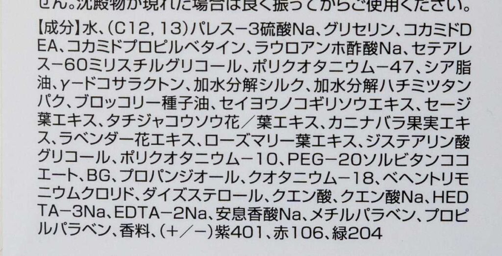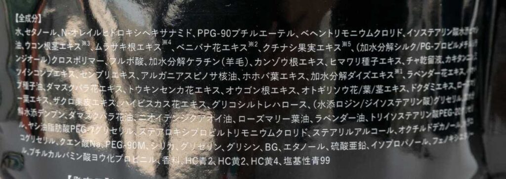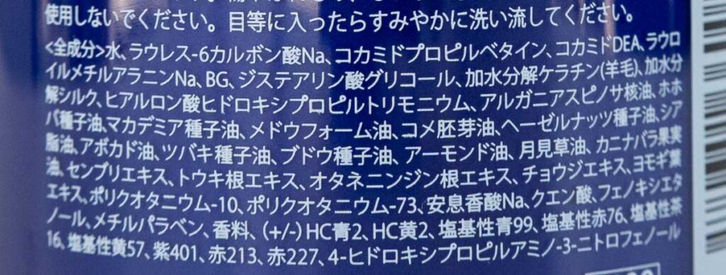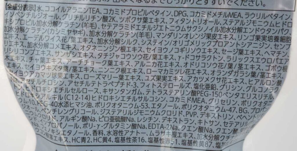 成分 | ★4 | アミノ酸系洗浄成分に加え、ヘマチンや植物エキスが配合されており、補修力に優れている。ただし、パラベン系防腐剤が使用されている点を考慮し、評価はやや控えめに。 |