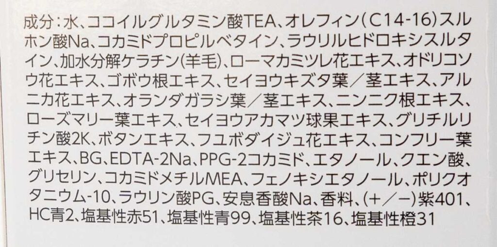 成分 | ★3.5 | 主成分がスルホン酸Naのため洗浄力はやや強め。ケラチンや植物エキスで補修・保湿のバランスは取られているが、髪質によっては乾燥を感じやすい点に注意が必要。 |