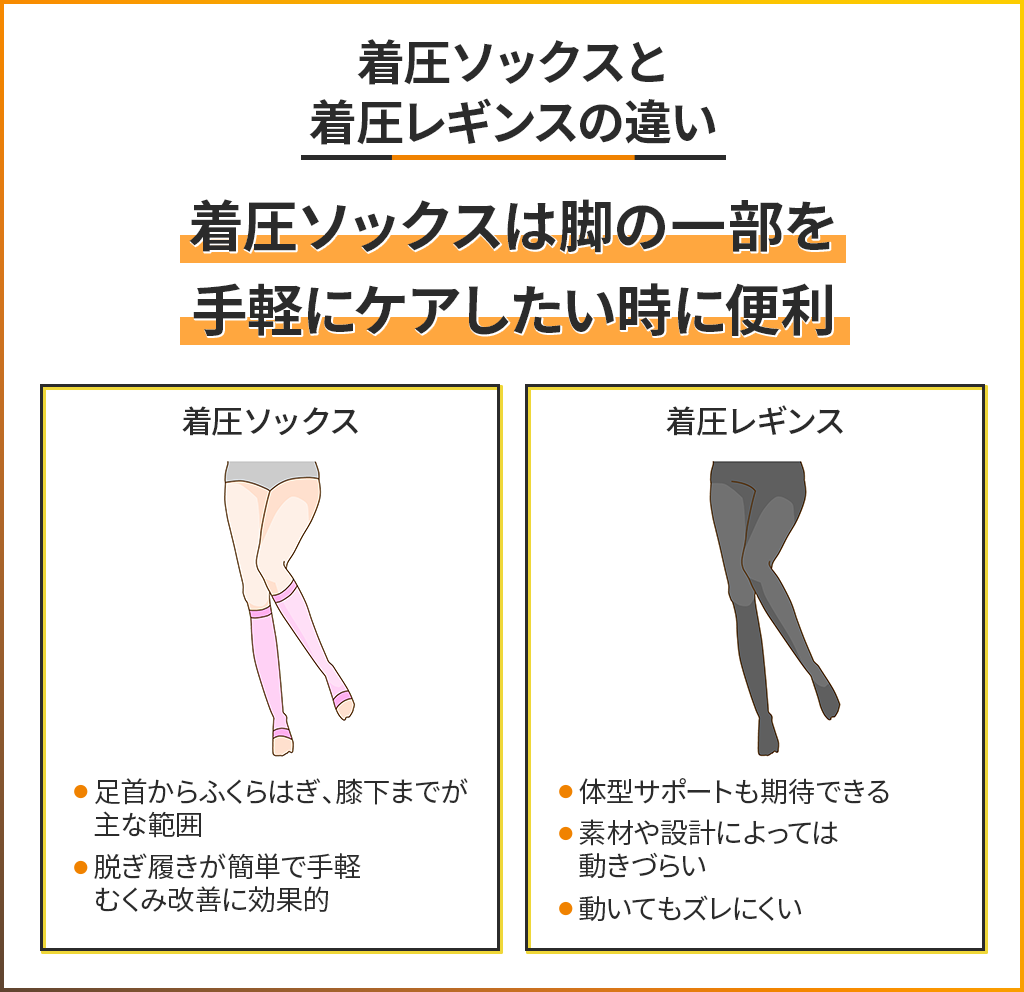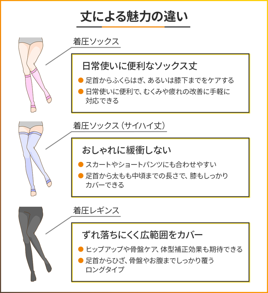 着圧アイテムは、カバーする範囲によって得られるケアの内容が変わります。