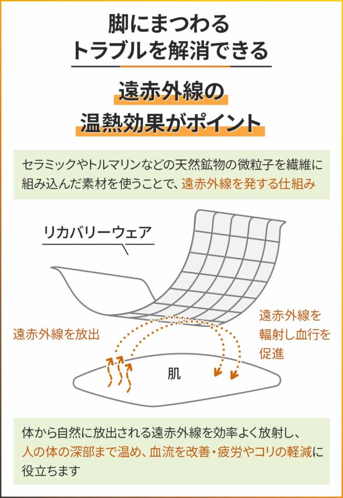 リカバリーウェアの大きな特長は、遠赤外線によって体をじんわり温め、血行を促すこと。