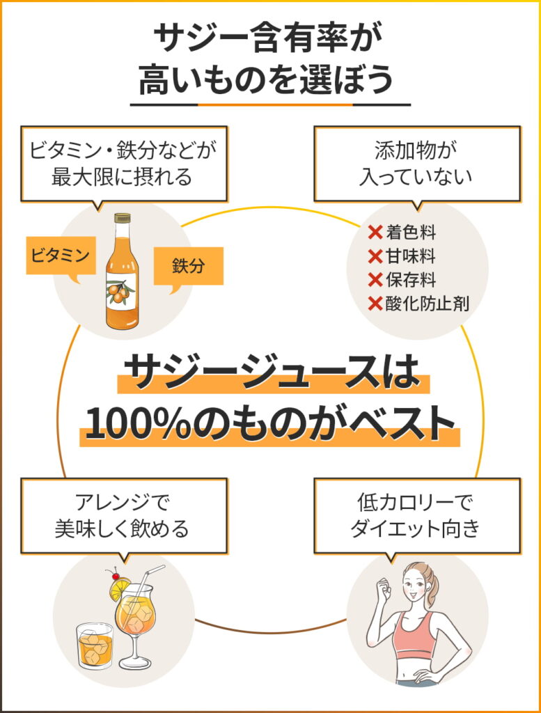 サジー含有率が100%に近いものほど、ビタミンや鉄分を多く摂ることができます。