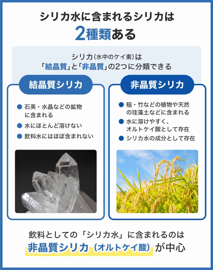 石英や水晶などの鉱物に含まれる固体のシリカ。水にほとんど溶けないため飲料水には含まれず、主に工業用に利用されます。 - 非晶質シリカ(オルトケイ酸)