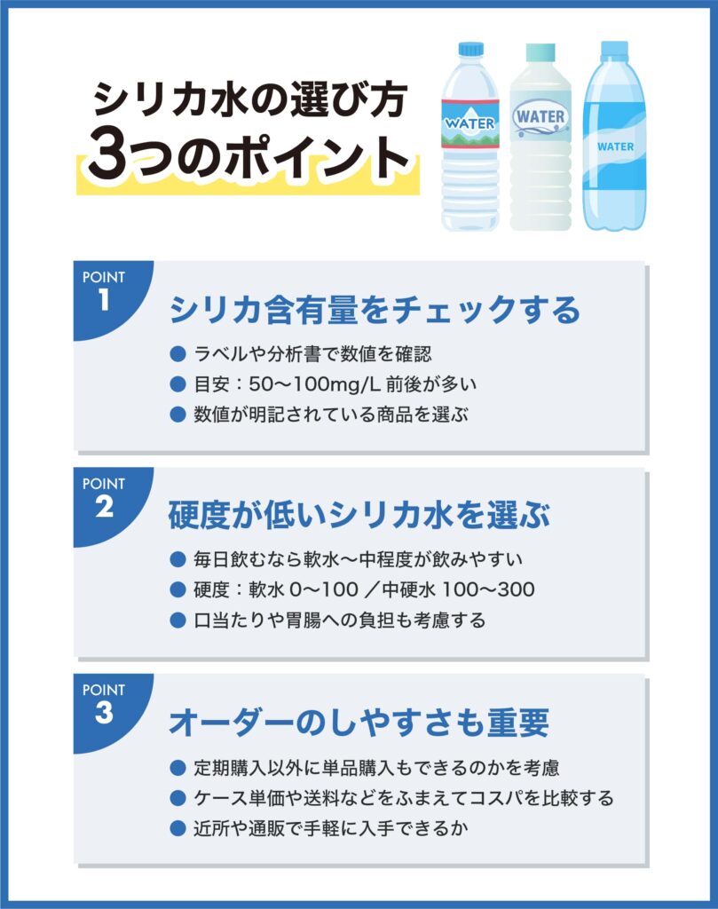 購入時は「シリカ含有量」「硬度」「価格・続けやすさ」の3つの観点でチェックをしましょう。