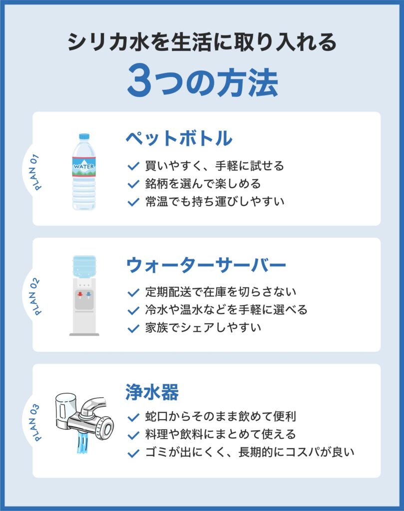 シリカ水は、生活スタイルに合わせてさまざまな形で取り入れることができます。