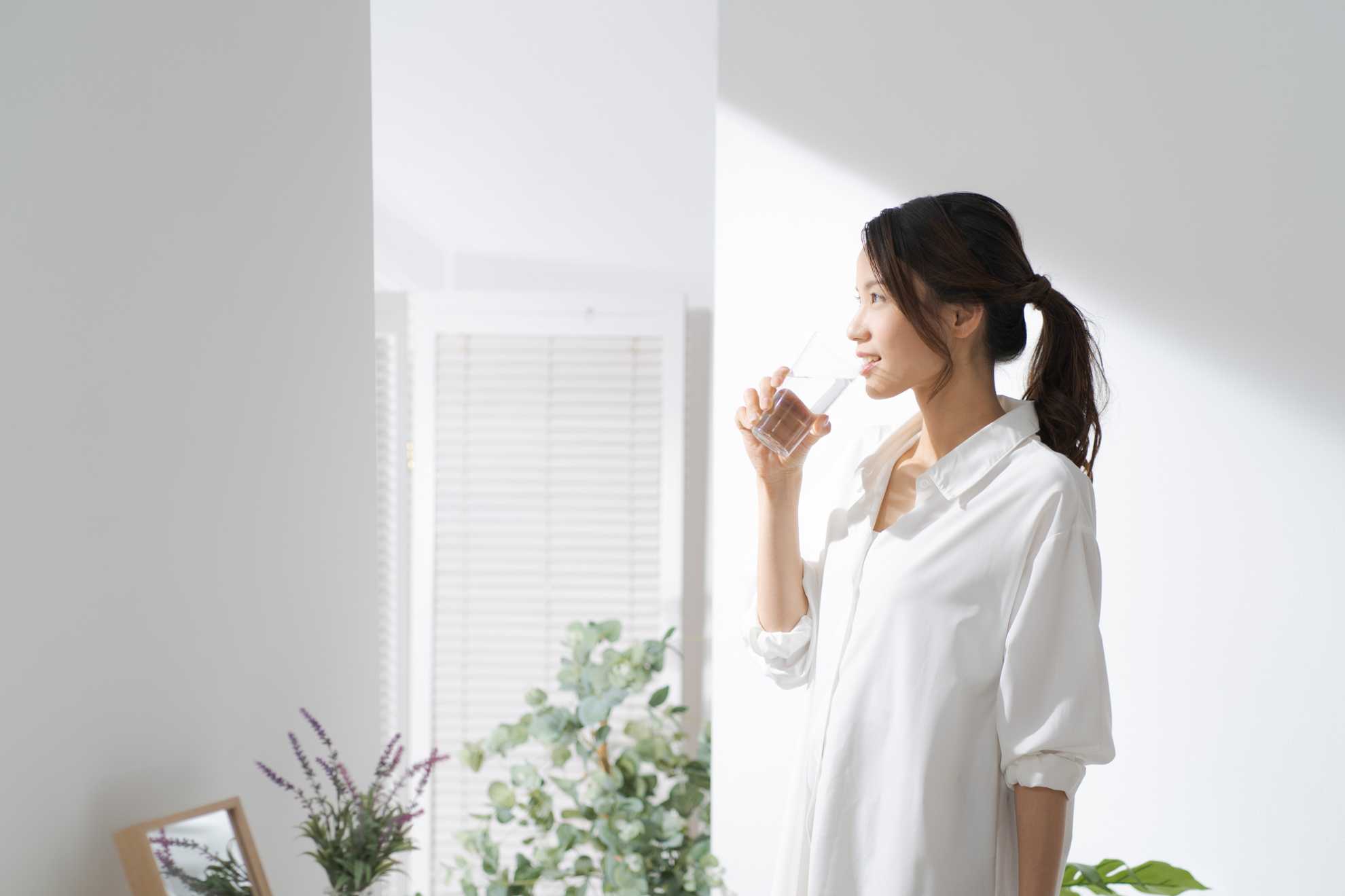 水は一度に大量に飲まず、1日0.9〜1.2リットルを目安にこまめに摂取しましょう。常温の水や白湯が体にやさしくおすすめですよ。