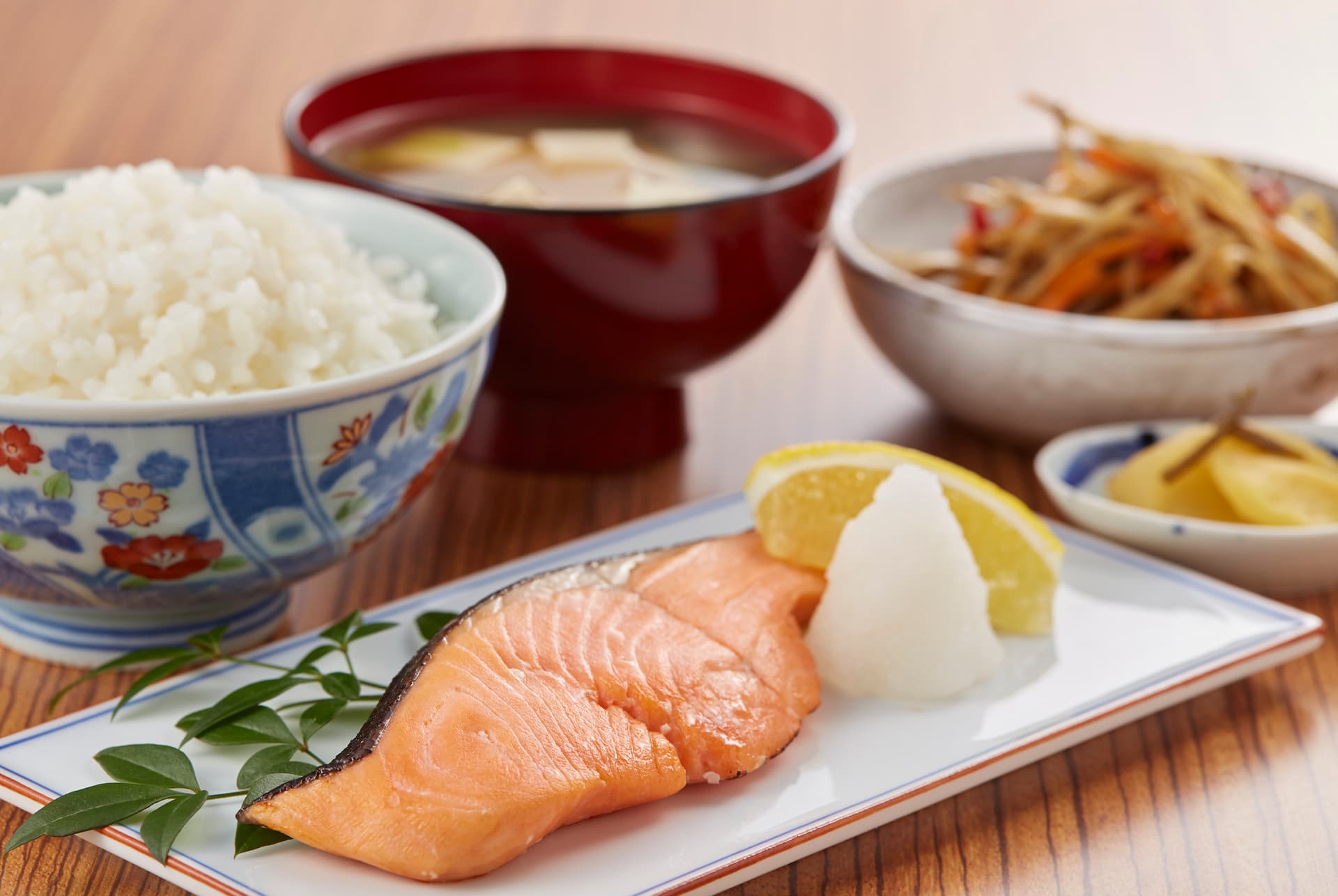 和食なら「鮭の塩焼き+白米ごはん+味噌汁+サラダ」の組み合わせもおすすめです。